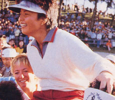 米ツアーの賞金女王を祝福される岡本綾子(1987年